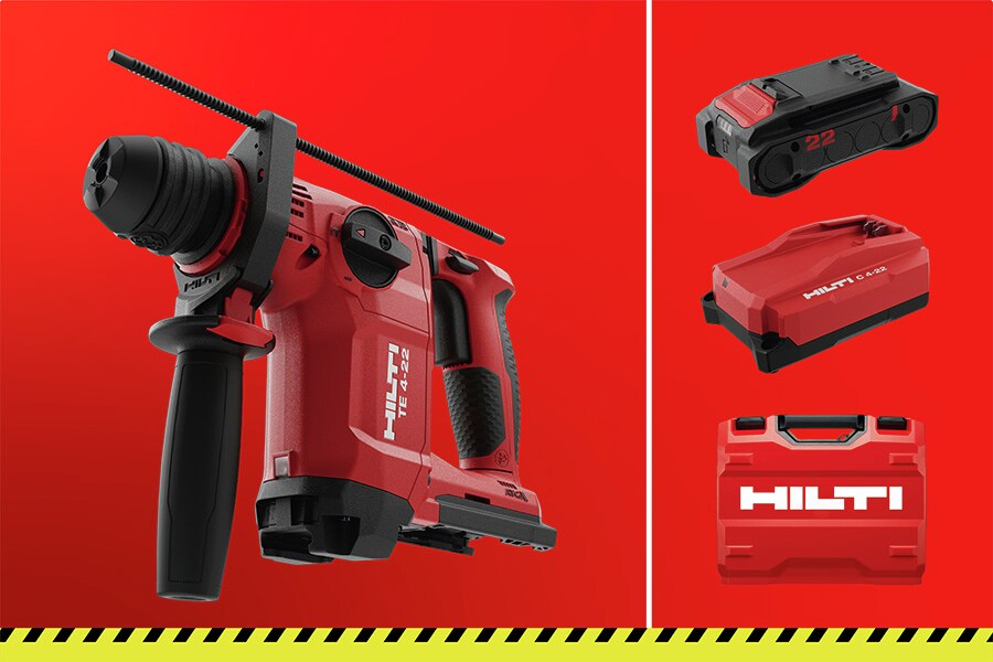 Il kit include martello perforatore TE 4-22 a batteria, batteria Nuron B 22-85, caricatore compatto Nuron C 4-22 e valigetta per attrezzi.