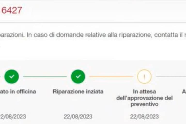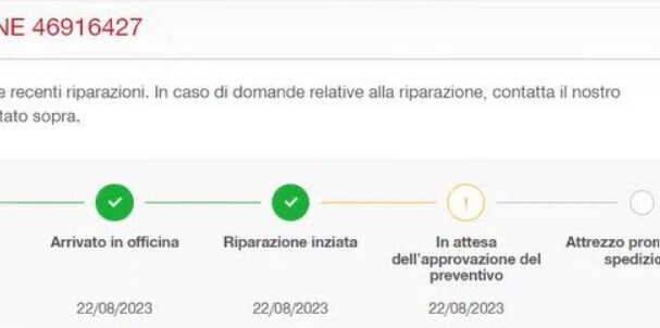 Riceverai una notifica tramite e-mail e nell'avviso di riparazione viene visualizzato un passaggio aggiuntivo per informarti che il preventivo è disponibile. Viene inoltre visualizzata una notifica nella parte inferiore dello schermo sulla dashboard. Senza la tua convalida entro 15 giorni, il processo di riparazione viene interrotto. La macchina ti viene quindi restituita disassemblata per ragioni di sicurezza.