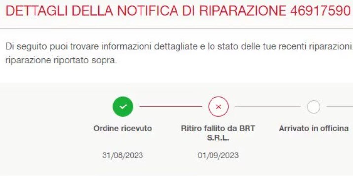 Nell'avviso di riparazione viene visualizzato un passaggio aggiuntivo per indicare l'errore di ritiro. Il nostro servizio clienti quindi riprogramma un nuovo ritiro per lo stesso giorno (se prima delle 12:00) o il giorno successivo.